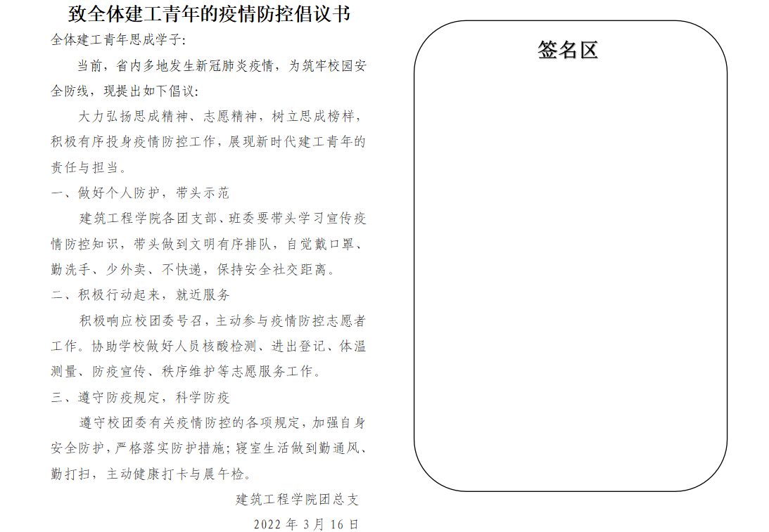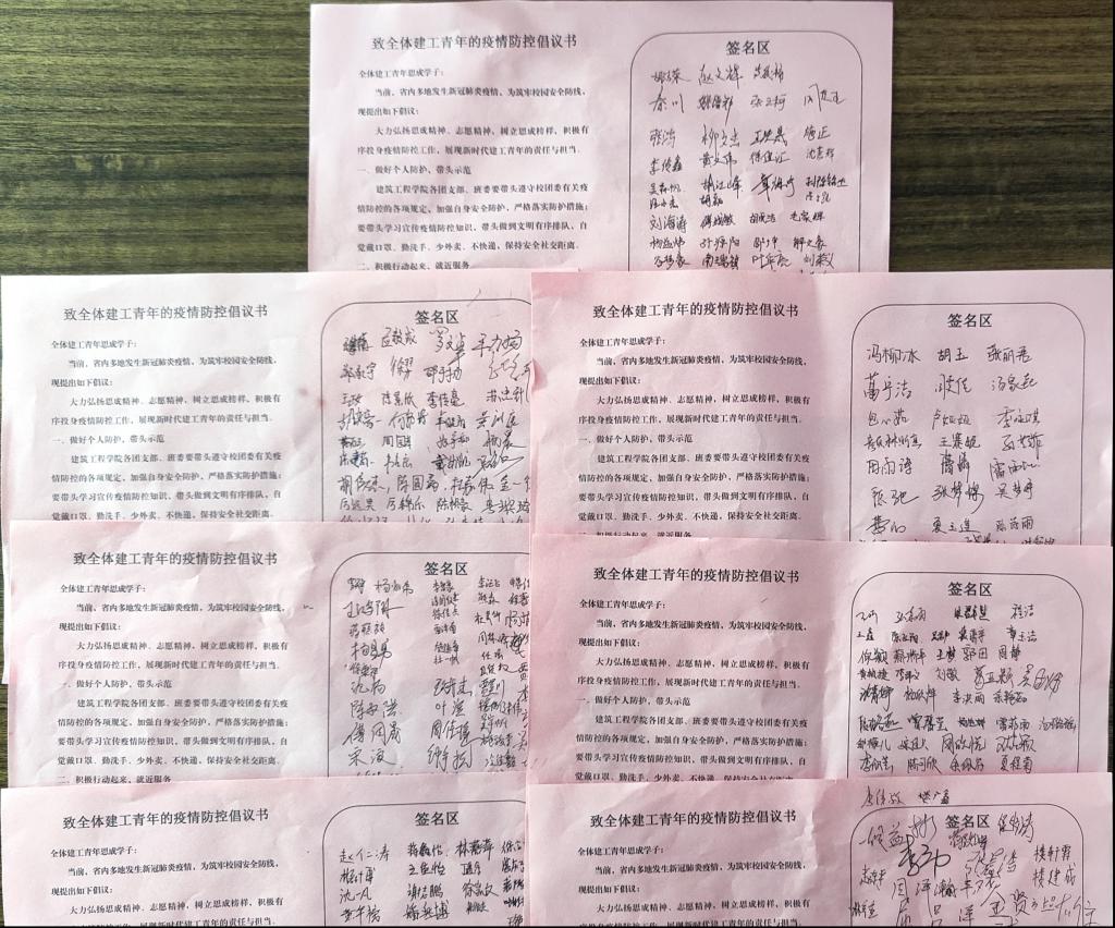 据悉,此次倡议活动是在省内多地发生新冠肺炎疫情、校园封闭式管理的背景下开展,由心理委员、退伍军人、青年志愿者组成的建工青年志愿服务队,入寝入户进行一对一宣传动员,使得同学们在思想认识、政策理解、防疫措施、生活习惯上均有了较大的改善,为筑牢校园安全防线贡献了自己的力量。