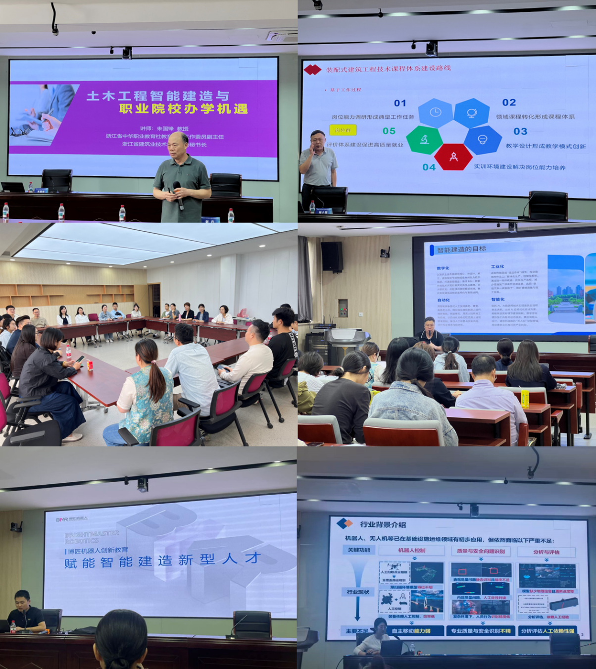 在专题报告环节,浙江省中华职业教育社教育科研工作委员会副主任朱国锋从产教融合角度提出人才培养方案,建议通过校企合作构建“理论+实操”一体化培训体系,缓解行业人才缺口问题。山东大学信息公司高级工程师陆小珊作了题为“聚焦智能,探索智能建造技术专业建设路线图”的专题报告,提出了基于岗位增量模式的专业人才培养新思路。浙江大学研究员舒江鹏则深入讲解了智能建造与数字孪生技术的融合应用,为智慧城市的建设提供了重要的技术视角。浙江建设职业技术公司智能建造技术专业负责人王琳结合实地教学经验,展示了智能建造技术在危旧房改造等工程中的创新应用。此外,机器人企业代表现场演示了建筑机器人自动化施工流程,凸显了智能化装备在降低人力成本、优化工程精度方面的优势。研修班还组织学员赴浙江大学国际医公司项目部实地观摩,通过案例研讨提升技术落地能力。